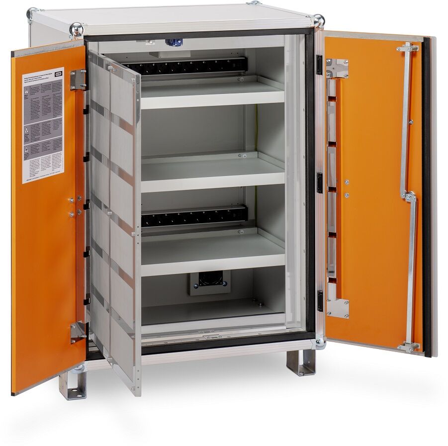 Gerade kritisch beschädigte Lithium-Ionen-Zellen können im Brandfall („Thermal Runaway“) eine ernste Gefahr für Personen und Betriebseinrichtungen darstellen. Stäube die durch diese Brände entstehen, können sich in Platinen von Produktions- uns Betriebsgeräten absetzten und diese dauerhaft schädigen. Dieser Ladeschrank verfügt über eine MPA-geprüfte Feuerwiderstandsfähigkeit über 60 min von Innen nach Außen in Anlehnung an DIN EN 1363-1. Ein realer Batteriebrandversuch wurde mit einer unabhängigen Universität durchgeführt. Die Zu- und Abluftöffnungen verschließen sich im Brandfall automatisch. Die Türen sollten beim Gebrauch aber stets geschlossen bleiben.