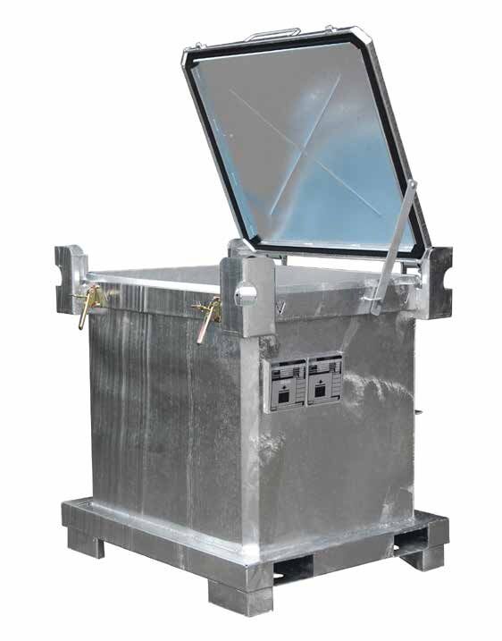 Alle gesetzlichen Regelungen, sowie etwaige Kennzeichnungen und Beschriftungen sind beim Transport zu beachten. Alle Umsetzvorgänge und Transporte des Behälters müssen mit geeigneten und betriebssichereren Mitteln erfolgen. Vor dem Transport ist darauf zu achten, dass die Haube fest mit dem Grundrahmen verschlossen ist. Beachten Sie die im ADR vorgegebenen Hinweise zur Beschriftung und Bezettelung.