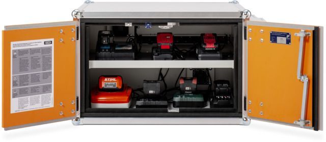 Gerade kritisch beschädigte Lithium-Ionen-Zellen können im Brandfall („Thermal Runaway“) eine ernste Gefahr für Personen und Betriebseinrichtungen darstellen. Stäube die durch diese Brände entstehen, können sich in Platinen von Produktions- uns Betriebsgeräten absetzten und diese dauerhaft schädigen. Dieser Ladeschrank verfügt über eine MPA-geprüfte Feuerwiderstandsfähigkeit über 60 min von Innen nach Außen in Anlehnung an DIN EN 1363-1. Ein realer Batteriebrandversuch wurde mit einer unabhängigen Universität durchgeführt. Die Zu- und Abluftöffnungen verschließen sich im Brandfall automatisch. Die Türen sollten beim Gebrauch aber stets geschlossen bleiben.