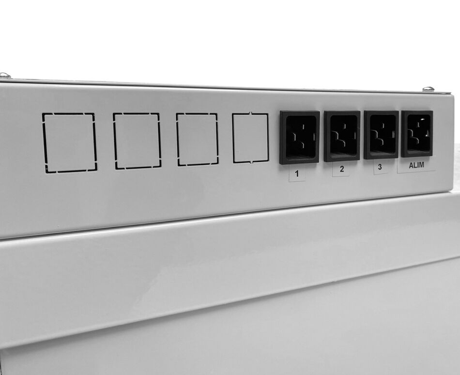 - Anschluss über integrierte Steckdosenleisten (z. B. 8 Steckplätze je Ebene)