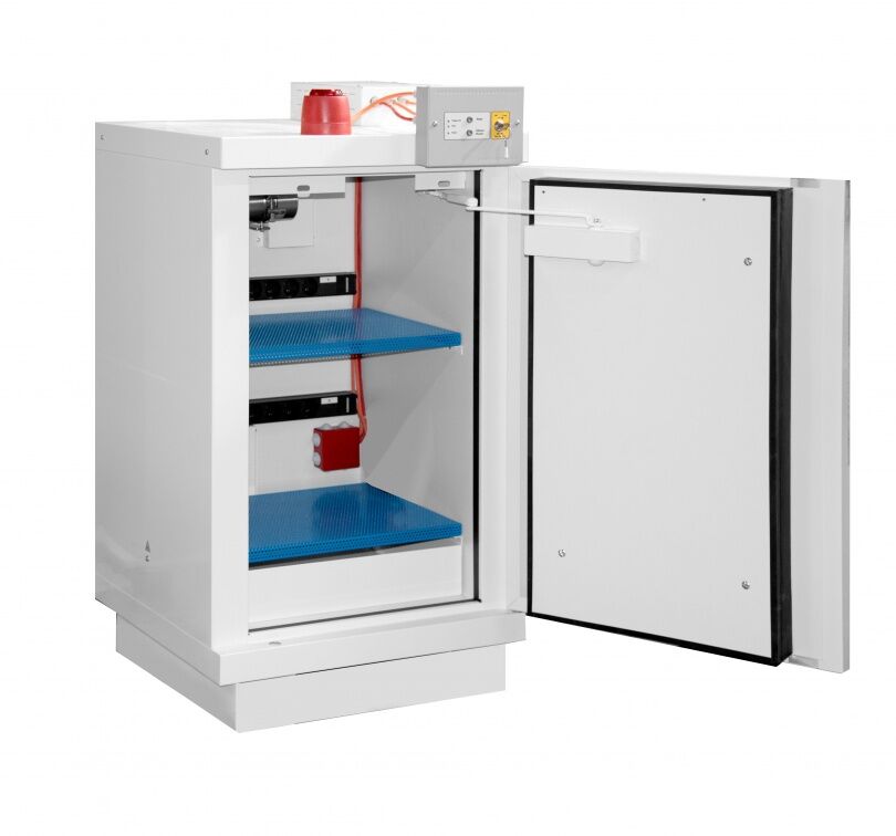 Lithium-Ionen-Batterien werden in den kommenden Jahren in allen industriellen Anwendungen nicht mehr wegzudenken sein. Bei unsachgemäßem Gebrauch kann aber von den Batterien bei der Herstellung, Lagerung und beim Transport ein nicht zu unterschätzendes Gefahrenpotenzial ausgehen. Durch Anschaffung eines passenden Sicherheitsschrankes sichern Sie sich von Anfang an gegen größere finanzielle Schäden ab, die bspw. durch Akku-Brände entstehen können.