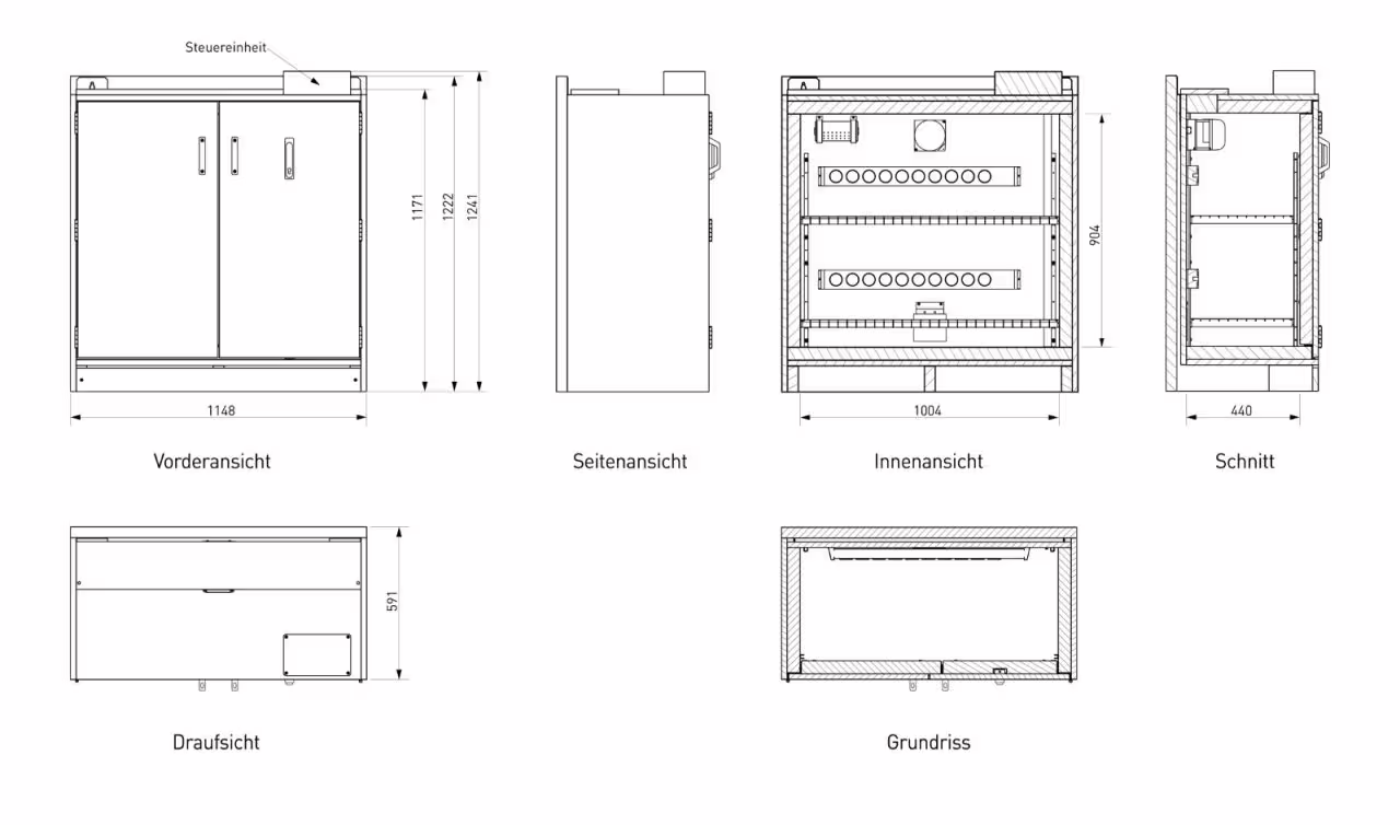 Außenmaße inkl. Steuereinheit: 1.241 × 1.148 × 591 mm