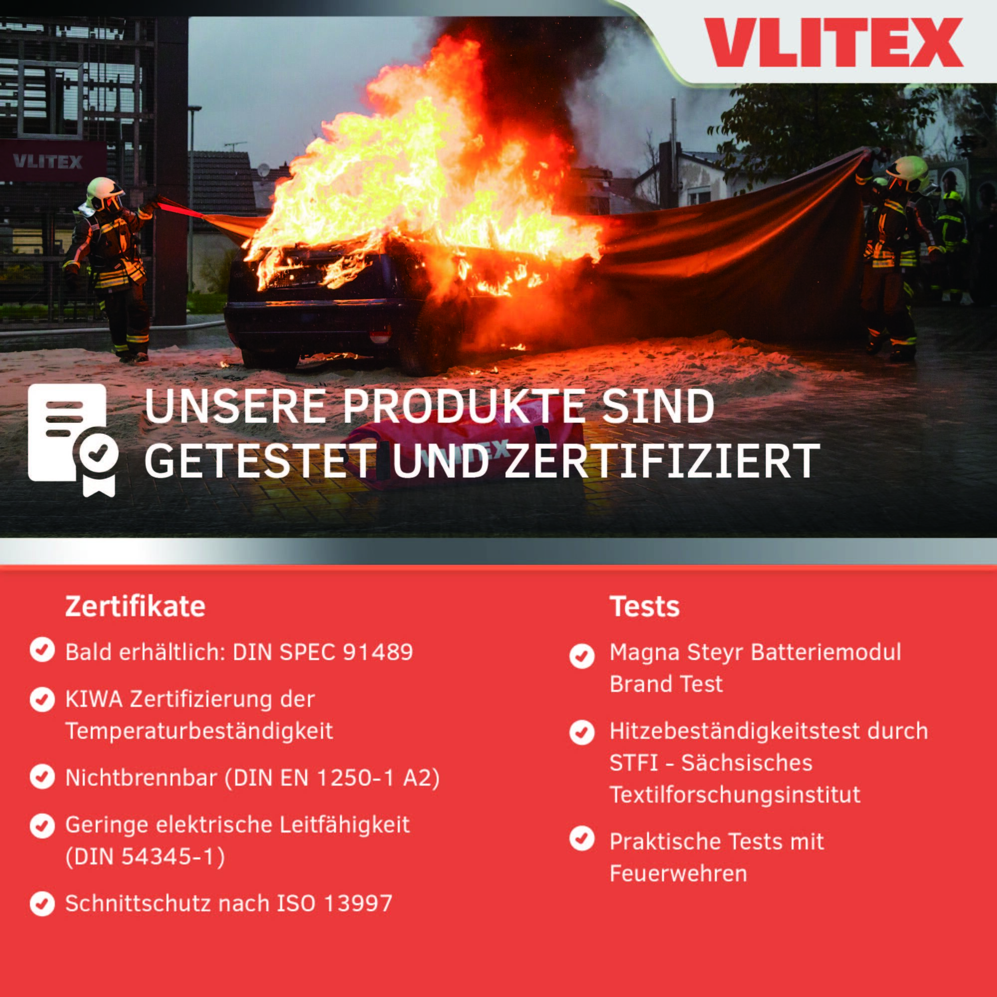 Die VLITEX Brandbegrenzungsdecke PREMIUM (im Folgenden synonym auch als Löschdecke oder Brandschutzdecke bezeichnet) ist für die Abdeckung von beschädigten oder brennenden (E-)Fahrzeugen und Geräten mit Lithium-Ionen-Akkus konzipiert. Sie dient dazu, Flammen unter der Decke bestmöglich zu isolieren, die Ausbreitung von Rauch und toxischen Gasen zu reduzieren, die Temperatur zu senken und Explosionen unter der Decke zu begrenzen.