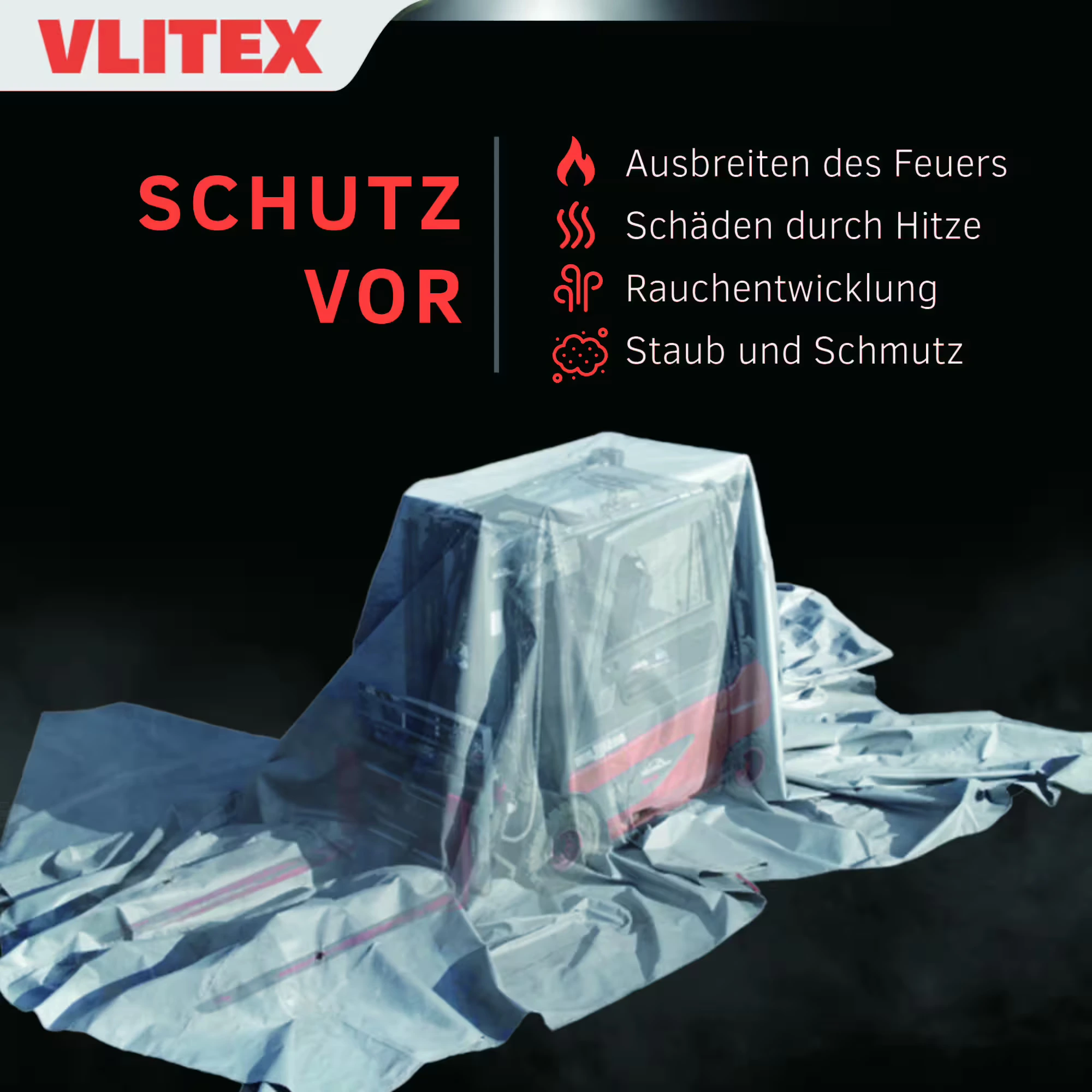 Die VLITEX Brandbegrenzungsdecke PREMIUM (im Folgenden synonym auch als Löschdecke oder Brandschutzdecke bezeichnet) ist für die Abdeckung von beschädigten oder brennenden (E-)Fahrzeugen und Geräten mit Lithium-Ionen-Akkus konzipiert. Sie dient dazu, Flammen unter der Decke bestmöglich zu isolieren, die Ausbreitung von Rauch und toxischen Gasen zu reduzieren, die Temperatur zu senken und Explosionen unter der Decke zu begrenzen.