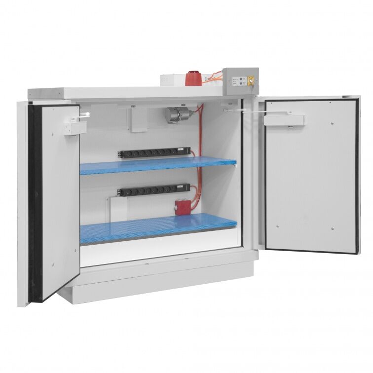 In this configuration, the Ecosafe 793+LIX2 safety storage cabinet for lithium-ion batteries is purely a storage system for lithium-ion batteries with two shelves, fire suppression system, alarm and safety package and floor collection tray. You can configure additional equipment such as socket strips via the accessories or the variants.