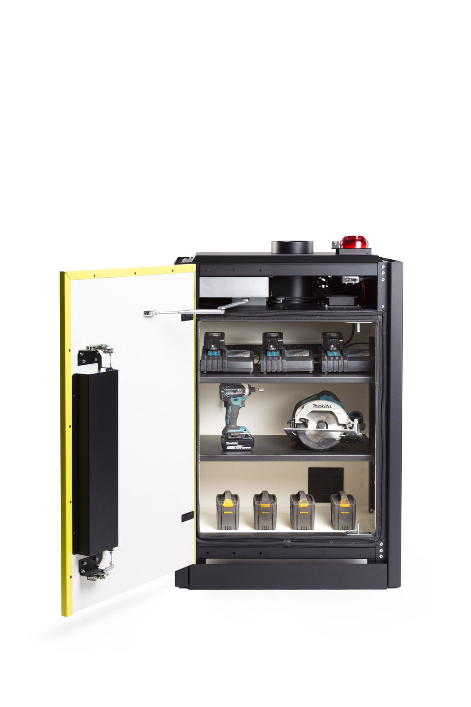 The LOXXER1100 VDMA Cabinet is a solution for the safe storage and simultaneous charging of lithium-ion batteries indoors. Thanks to its fire-retardant design, integrated sensors, alarm functions and optional fire suppression, the cabinet supports controlled risk management when handling lithium batteries in commercial and technical environments.