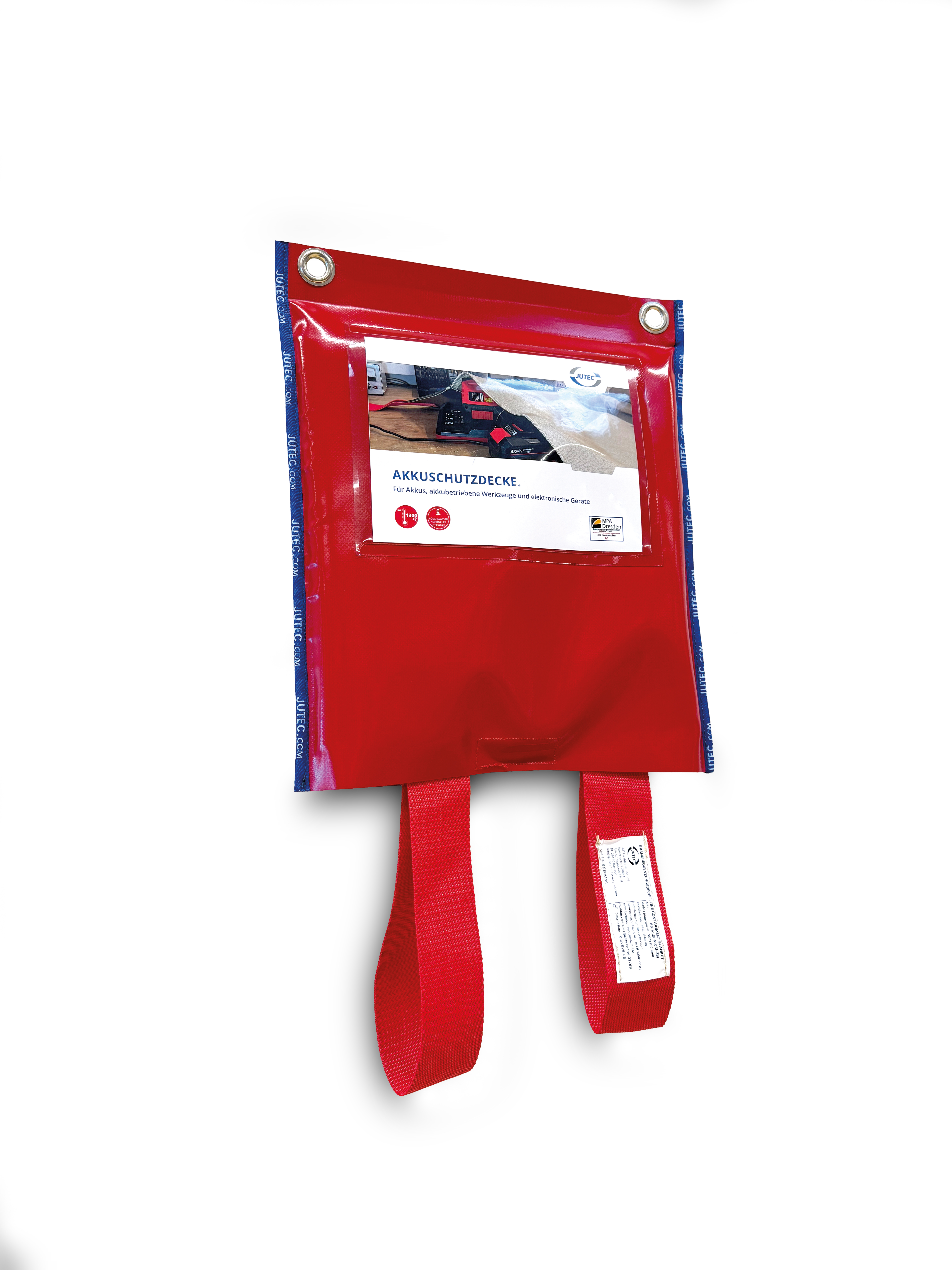 The JUTEC fire blanket (hereinafter also referred to synonymously as fire blanket or fire protection blanket) is designed to cover damaged or burning devices with lithium-ion batteries. It is used to isolate flames under the blanket in the best possible way, to reduce the spread of smoke, toxic gases and contaminated extinguishing water, to lower the temperature and to limit explosions under the blanket.