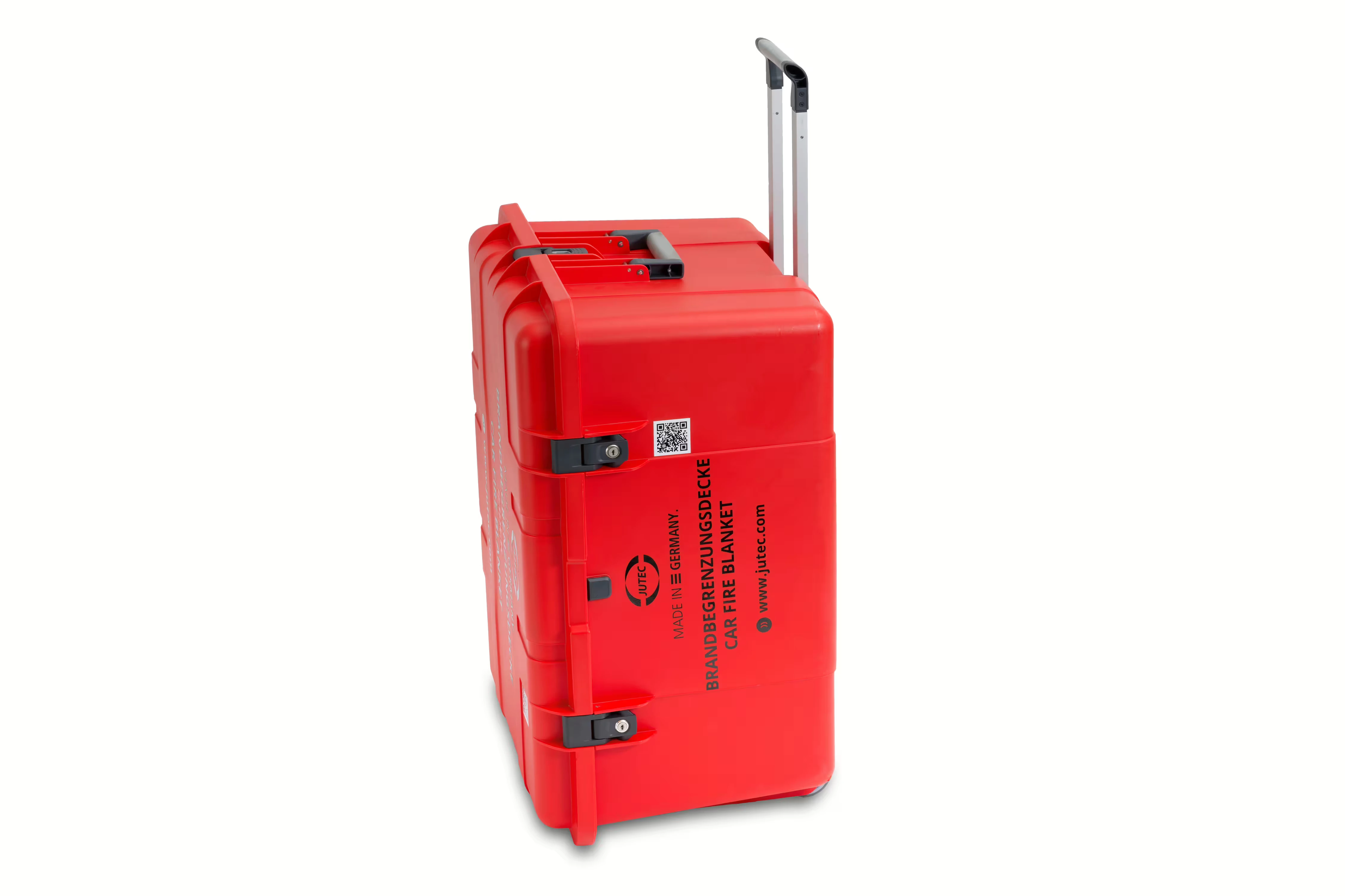 The JUTEC fire blanket (hereinafter also referred to as a fire extinguishing blanket or fire protection blanket) is designed to cover damaged or burning devices with lithium-ion batteries. It serves to isolate flames under the blanket as effectively as possible, reduce the spread of smoke, toxic gases and contaminated extinguishing water, lower the temperature and limit explosions under the blanket.