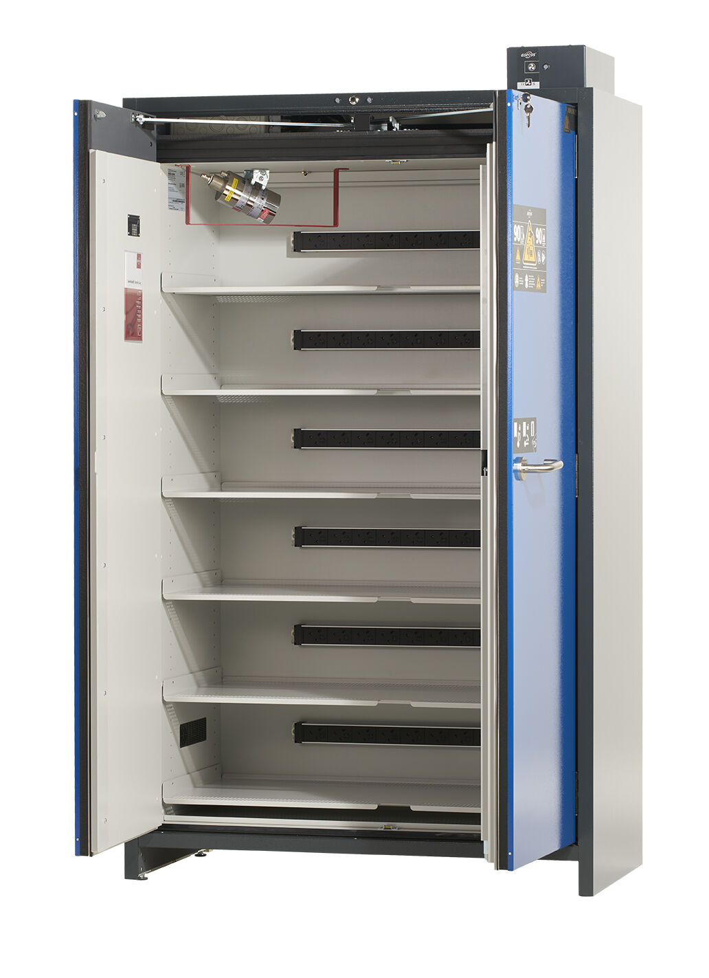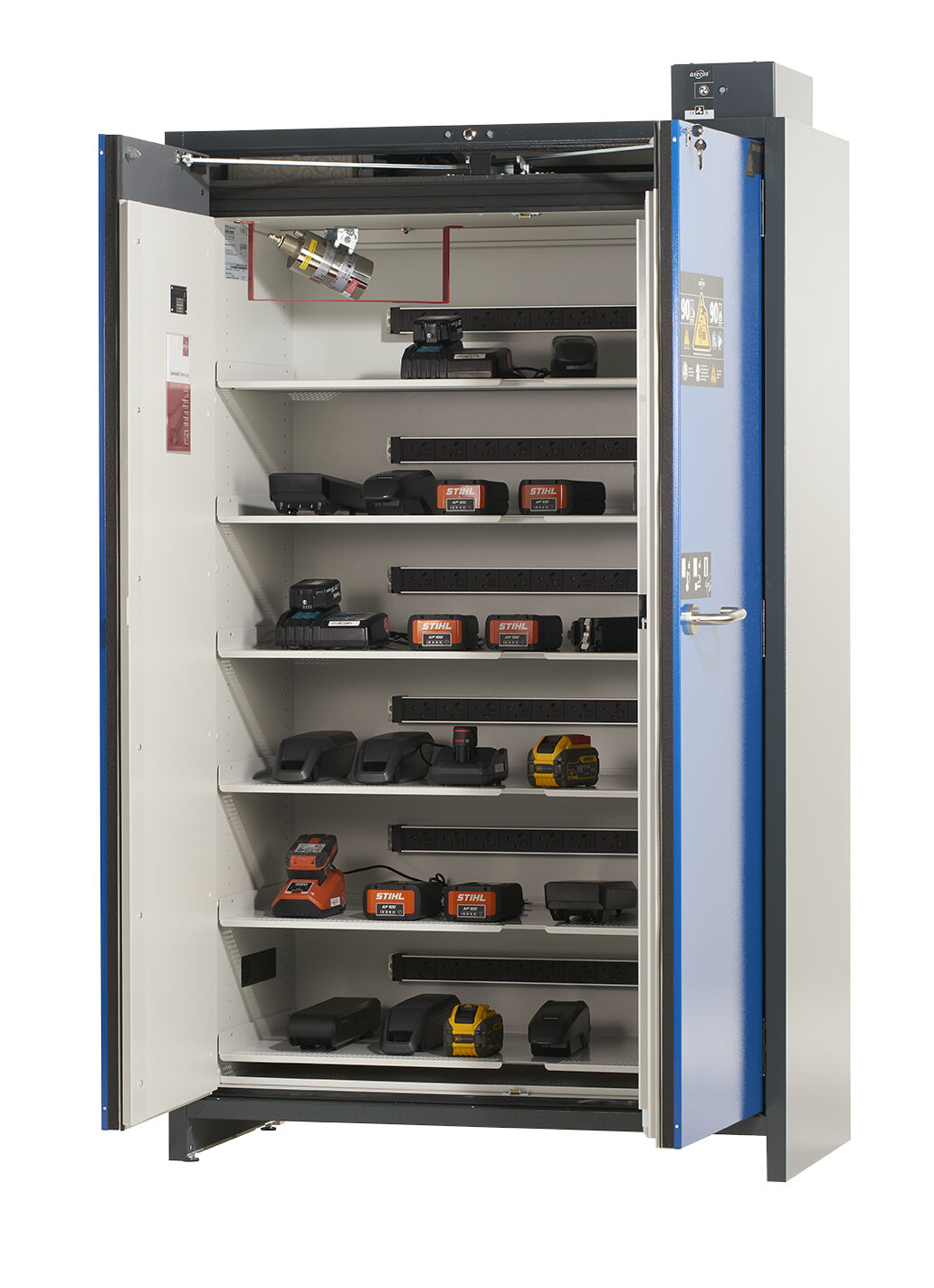 The asecos PRO CHARGE security cabinet from ION-LINE was specially designed for the safe storage and charging of lithium-ion batteries. The model combines tested fire protection with an integrated warning system for early detection of potential danger states during the charging process.